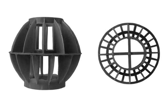 多面空心球中間鏤空結(jié)構(gòu)形成空隙大,不易被阻塞的特性。這種結(jié)構(gòu)在空氣洗滌、廢氣吸收、灰塵過濾等廢氣處理工程方面應(yīng)用,具有處理風(fēng)量大、阻力小的特點。由于多面空心球的空隙中有較高的滯液量,可使塔內(nèi)液體停留時間長,從而增加了氣體與液體的接觸面積和接觸時間,便廢氣得到充分吸收處理。